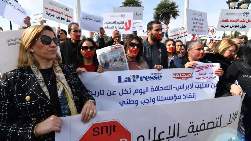 تونس – (أ ف ب): تظاهر عشرات الصحافيين ونشطاء حقوق الانسان اليوم، في تونس للتنديد بسياسة الحكومة التي يعتبرونها “قمعية” في محاولة لترويع وسائل الإعلام الخاصة والحكومية وقمع الحريات.