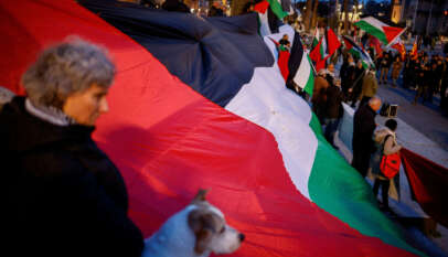 متظاهرون يحملون أعلاماً فلسطينية خلال احتجاجات على زيارة رئيس الوزراء الإسرائيلي بنيامين نتنياهو إلى…